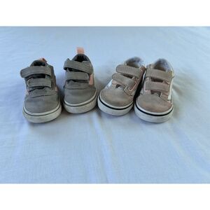 This is a set of girls toddler Van shoes. They show a little bit of wear but are not too bad. The pink ones have some smudges on them, but overall, the shoes are in good condition and very cute! The gray ones are a size 5 and the pink ones are a 5.5. They have velcro closures.