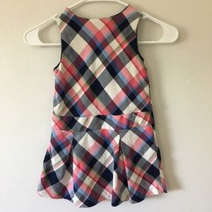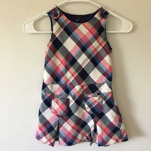 Adorable little girl's plaid Tommy Hilfiger dress with two front pockets, over the shoulder buttons, side zip, and embroidered Tommy logo on bottom right of dress. No lining.