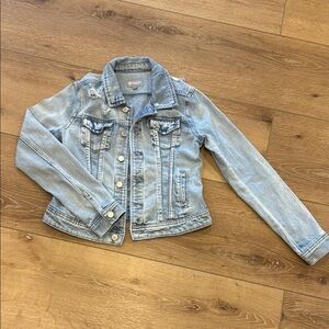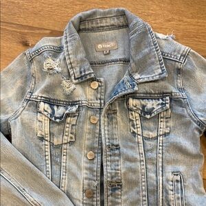 Stylish light blue denim jacket with distressing, button up. Great condition, girls size medium. From Nordstrom, Tractor brand