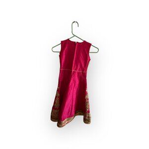 Vibrant sleeveless ethnic dress in girls size 24, featuring rich red and deep pink tones with intricate gold embroidery and embellishments. Designed with a fitted bodice, flared skirt, and zipper back closure for easy wear. Embellished with floral and paisley patterns, this dress is perfect for weddings, cultural celebrations, or festive events. Lightweight and comfortable with elegant detailing throughout. Gently used and in excellent condition—photos show full design and craftsmanship.
