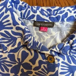 Short-sleeve button-front top with bold floral print. Blue and white colorway with a relaxed collar. Lightweight, breathable fabric. Easy to pair with skirts or shorts.
