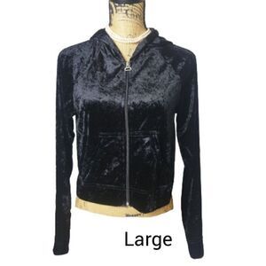 Girls Velour Hooded Jacket L Black Lightweight Chic Zip Up Jacket Pockets Lg