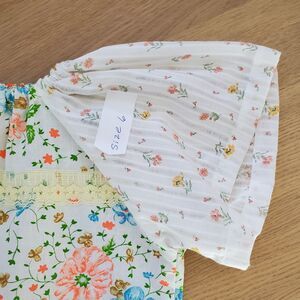 Vintage 70s girl's handmade white floral pillowcase short-sleeved dress with elastic neckline, yellow lace, and bottom ruffle.