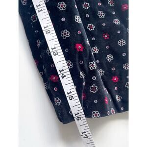 Black velour, with small floral print. Carpenter style with pockets and loop.