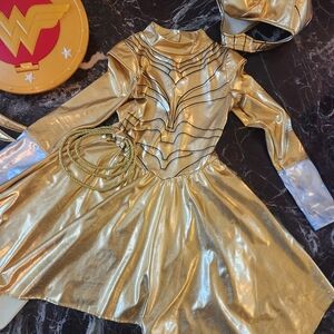 Shine in this dazzling gold superhero costume, perfect for imaginative play and Halloween. Only worn for trick-or-treating, once. Includes a dress, all accessories, lasso, and the shield. Absolutely no flaws whatsoever. Size medium. Comes from a Smoke-free, pet-free, and fully vaccinated home.