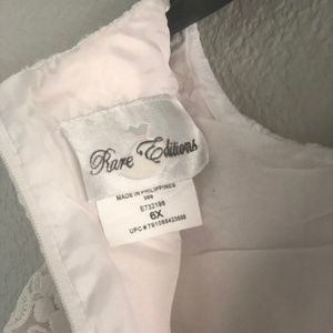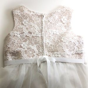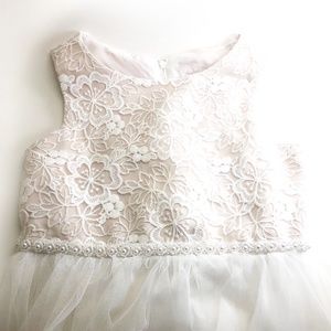 Worn once, excellent condition. A-line flower girl dress with champagne top with white lace overlay, satin roses and pearl waist trim with an asymmetrical white tulle skirt and satin ribbon tie back. Girls size 6x.