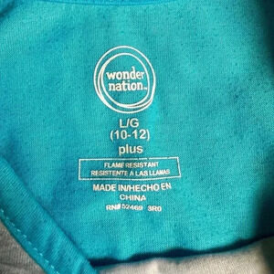 Get ready for some magical sleep with this Wonder Nation yoga unicorn shorts pajama set in size 10/12 Plus. The set includes a pullover top with a rainbow unicorn graphic print and short sleeves, perfect for all seasons. The lightweight, blended fabric makes it comfortable to wear and easy to care for with machine washable instructions.