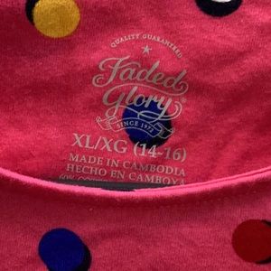 This is a cute dress by Faded Glory. It’s in EUC. It’s pink with multicolored polka dots. Long sleeves.