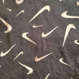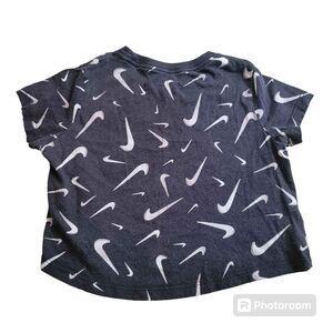 Girls size youth medium, cropped Nike tee. It has been well loved but has lots of life left. No stains or rips. Black with white swooshes all over.