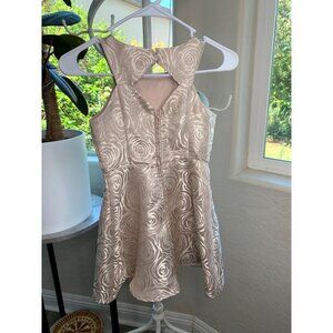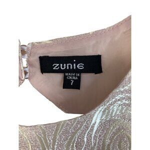This NWOT Zunie dress is perfect for young girls. Size 7, fit & flare style in a subtle pink color, with metallic floral jacquard pattern and stylish cutout detail.