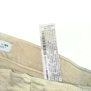 Pre-owned Zara size 13-14 light beige flare jeans. The jeans have a classic five-pocket design with a zip fly and button closure. The fabric is soft and comfortable, and the jeans have a slight stretch. The jeans are in good condition with no visible rips or tears. The jeans are made in Turkey and have a care label with instructions for washing and drying.