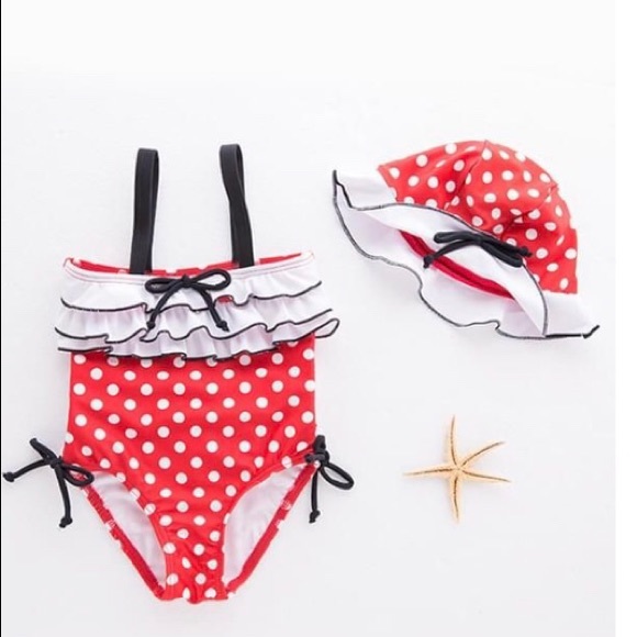 Adorable pocka-dot 2 piece bathing suit (hat included) sizes 12M-24M and 3T-6