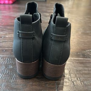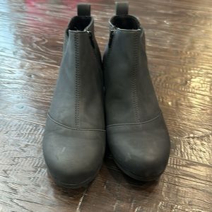 Like new!! Girls black wedge booties from Toms. Wedge is a dark brown. All other parts of boot are black. Side zipper. A favorite shoe in our house. Just outgrew this one too quick!