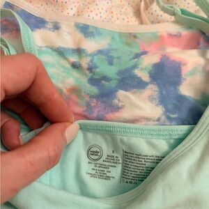 Girls first bra sets. Includes tie-dye, polka dot, aqua, pink, and white options. Perfect for layering or lounging.