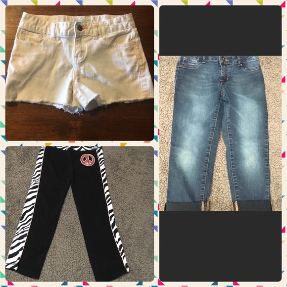Girls bottoms shorts size 12 jean capris size 12 and black capris from justice size 14 . Shorts nwot and capris in great condition