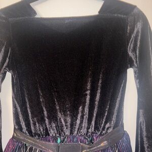 Transform into a magical witch with this enchanting costume. Featuring a stunning black and purple design, it's perfect for Halloween or dress-up fun. Let your child's imagination soar with this spellbinding outfit. Dress only in a size medium. There is some fringing on the bottom from wear other than that in great condition. Size chart in photos. Purchased for $45 worn once.
