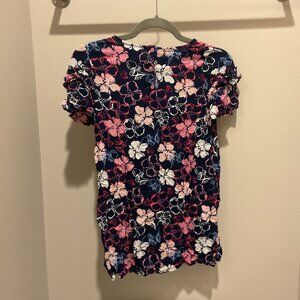 navy blue floral design with pink and white. ruffle sleeved and oversized tee fit. girl's size small