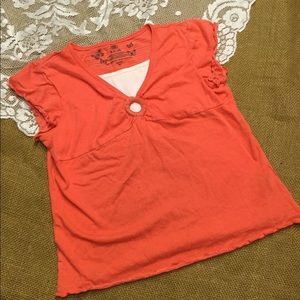 This is a dark coral pullover shirt, girls size M (7/8). It’s in good condition, but there are two tiny black dots on the front (see pics).