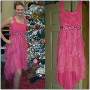 Beautiful hi low girls dress size 14. Sparkly glitter and sequence. Only worn once