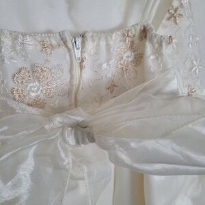 I have 2 of this dress. 1st 2 pictures are different dresses. zip and ties in back. layers to make dresses puffy. size 5. off white and gold. no stains, no holes