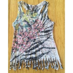 This is our children's refashioned fringe top. This is a fun spring/summer little girls top. It has fringe at the waist. This is a perfect top for that outspoken rock n roll little girl in your life! She will love it! It is 12 1/2 inches in bust area and 20 1/2 inches in length (measured from shoulder down to end of fringe). Please make sure to take measurements.
