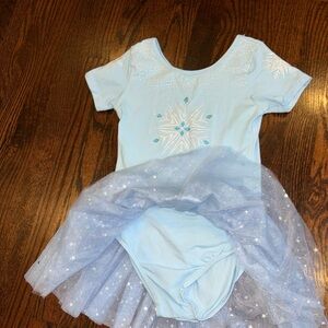Girls frozen leotard / dress. Perfect for a Disney trip as it has the shorts attached stretchy material that says size 150. But I think it would fit sizes 8 to 10 best.