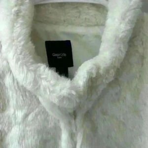 This is a white furry gap kids girls vest, size extra extra large. Hook enclosures on the front the shell is 74% acrylic 26% polyester and the lining is 100% polyester. Adorable addition to any girls fall look.