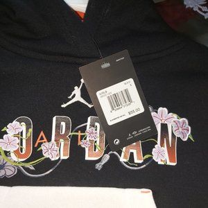 This multicolor (black, white, purle with floral pattern) Jordan pullover hoodie is great to pair with some blue or black jeans for a school aged girl. It's great to wear in the spring, fall or even winter months underneath a coat for extra warmth.