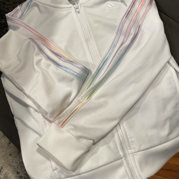 Adidas girls jacket size L or 14 in great condition.All white with shiny colorful stripes on sleeves.