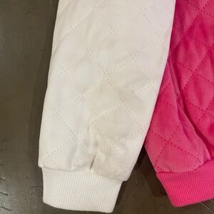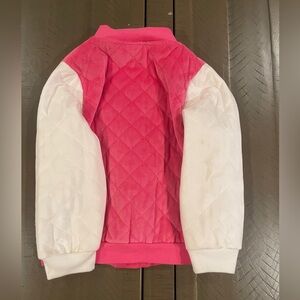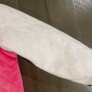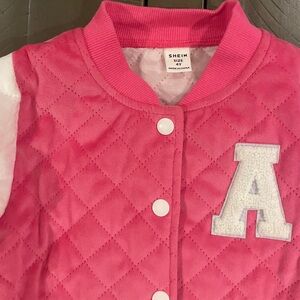 Girls varsity jacket. SHEIN. Only worn couple times. Size 4T. Bright pink and white. Some minor stains on back of sleeves as pictures. Barely visible on. Soft velvet texture.