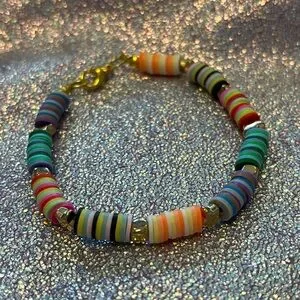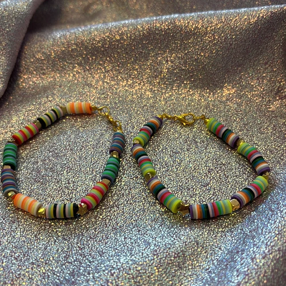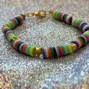 Girls multi colored clay beads bracelet with gold star and block charms.