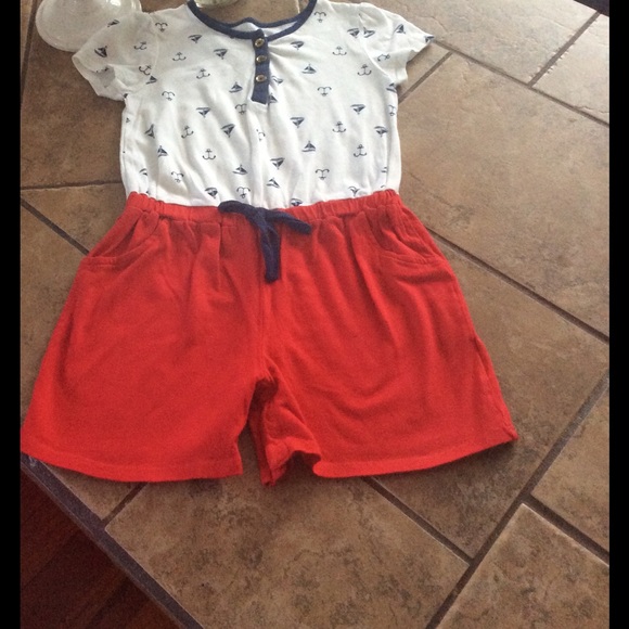 Old navy romper with blue sailboat and anchors on top and red shorts. Size 4t. Very good condition