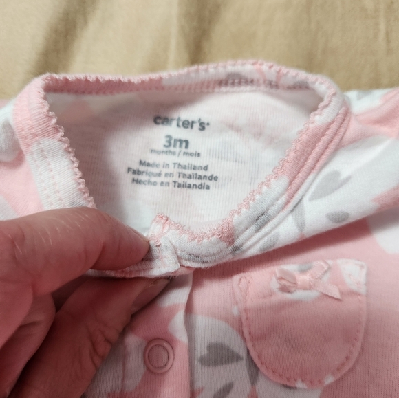 Bundle includes one footie pajamas with snap enclosures and floral print. One without feet and a butterfly print with snap enclosures. One is a sleep sack with a floral pattern. All size 3 months