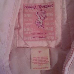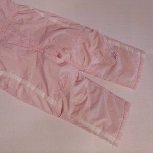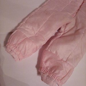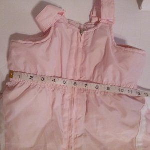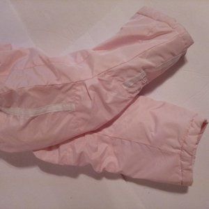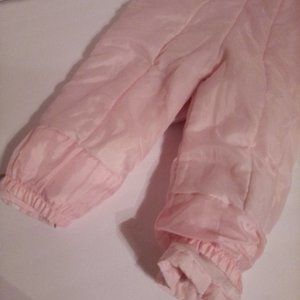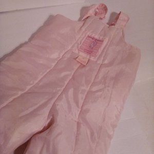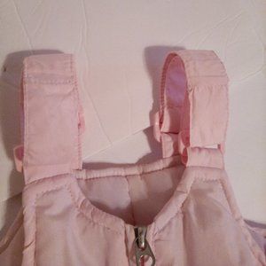 In good preowned condition. Cute pink girl's bib. Made of polyester. Measures: side underarm to bottom 26 1/4", inseam 15", armpit to armpit 14". From a smoke free and cat/dog friendly home. (5)