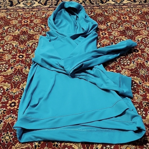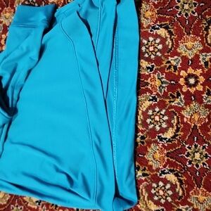polyester/spandex pullover. snug fit. GUC. Color is more of a blue/ green mix