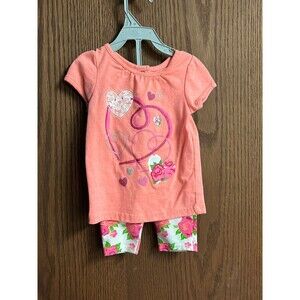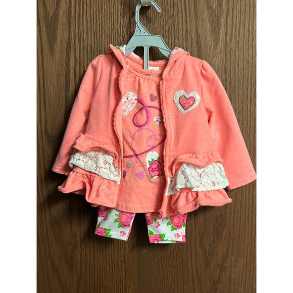 Cute 3pc jacket, t shirt and capris. Worn once. Like new. 24m. Coral in color.