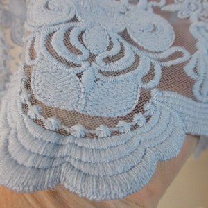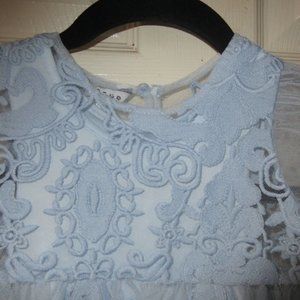 A very pretty blue lace dress with a cute bottom of the dress.Pullover dress with a single button closure. Lined in a soft blue stretchy fabric. Sleeveless with a little tulle cap sleeve. Size 2T. Very gently used and in like new condition. It was recently dry cleaned after a single use.