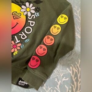 Justice Sport girls size 5/6 pullover style long cuffed sleeves sweat shirt, round neckline, smiley face with flowers design on frontb& down left sleeve, color is green with yellow, pink, orange, blue & white fabric is 68% cotton & 32% polyester good condition cc