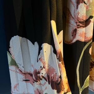 Cream colored loose “cowl” neck with soft feel Ann’s float flower pull on ankle length skirt and to complete this adorable outfit a forest green, wide brim hat with brown leather string detail.