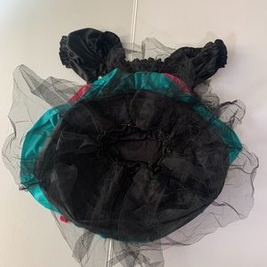 Girl's Day of the Dead themed dress with skeletal design and multicolored frills.