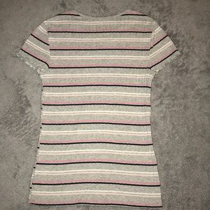 This shirt is in good condition. It has light pink, black, and white stripes. It is a more fitted shirt and is super cute. This shirt is also a size 13/14 but fits like a girls XL. Thank you for shopping my closet and let me know is you have any questions!