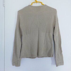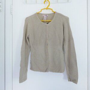 - wear buttoned or unbuttoned with a brown colored panel inside that is attached to the cardigan