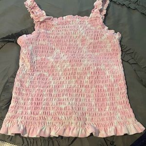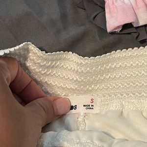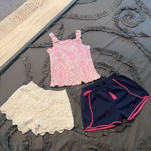 Girls bundle of clothings. 2 shorts and 1 top. Clean and excellent used condition. Shorts colors are creamy white (lined), navy blue and pink with tassels, top is pink and white tie-dye. Different brands, bought from Dillard’s. Sizes 8/10 or S/M.
