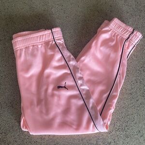 These pants are new with tags and are the bottoms from a 2 piece set. Really pretty peach colored fabric that is silky on the outside and soft and fleecy on the inside. Black trimmed striped panels down the side of the legs, elastic waistband and cuffs. There are some light marks along the butt area and I am unsure what they are from; I was able to remove a test spot with rubbing alcohol so I believe they should come out in the wash (see last 3 pics). They aren’t very noticeable and will likely be covered by a shirt hem. See pics for measurements.