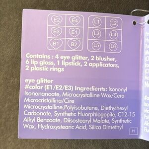 Charming makeup set with diverse colors. Includes lip gloss, lipstick, eye glitter, blusher, 2 rings and applicators. Ideal for dress-up play and creative expression.