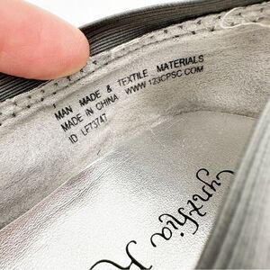 Burnished silver leather uppers with a manmade sole. Elastic opening for easy on and comfort. Fabric flower elevates them to an evening or formal, party shoe. Comfortable, so no complaints about dressing up.