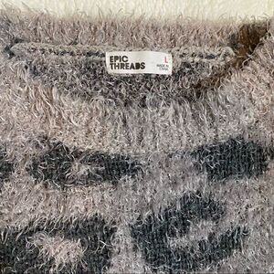 Girls Epic Threads Animal Print Metallic Eyelash Sweater Size Large. Adorable and fuzzy with trendy cheetah animal print. The colorful pink blue and yellow metallic threads add a special touch to this gray and darker gray sweater!