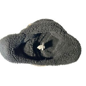 Girl’s polyester fleece winter hat with earflaps. Black lining and black and tan print exterior. Onesize but larger size fits bigger kids 8-14.