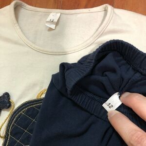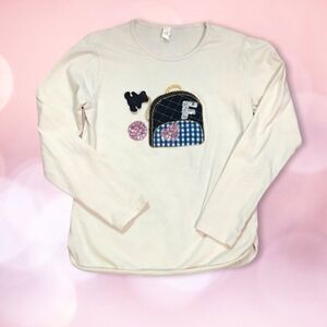 Top is a cream/light beige color and features small backpack appliqué with a sequin heart and letter “F” as well as a hanging teddy bear charm.