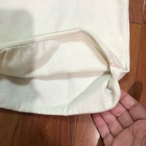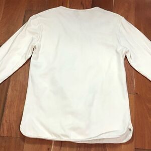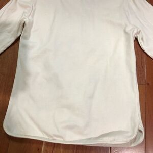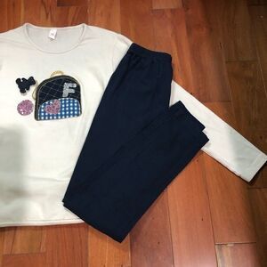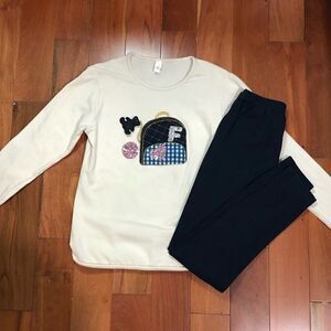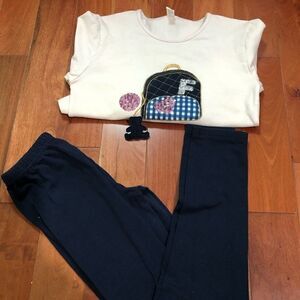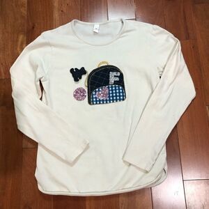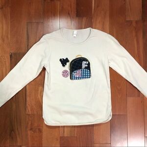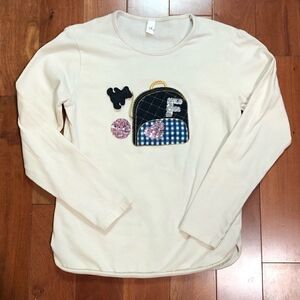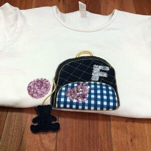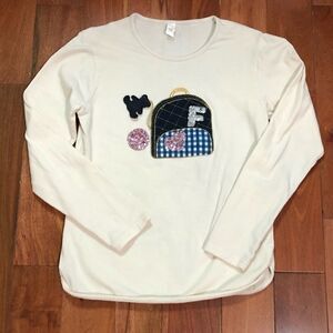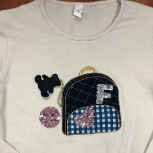 Top is a cream/light beige color and features small backpack appliqué with a sequin heart and letter “F” as well as a hanging teddy bear charm.